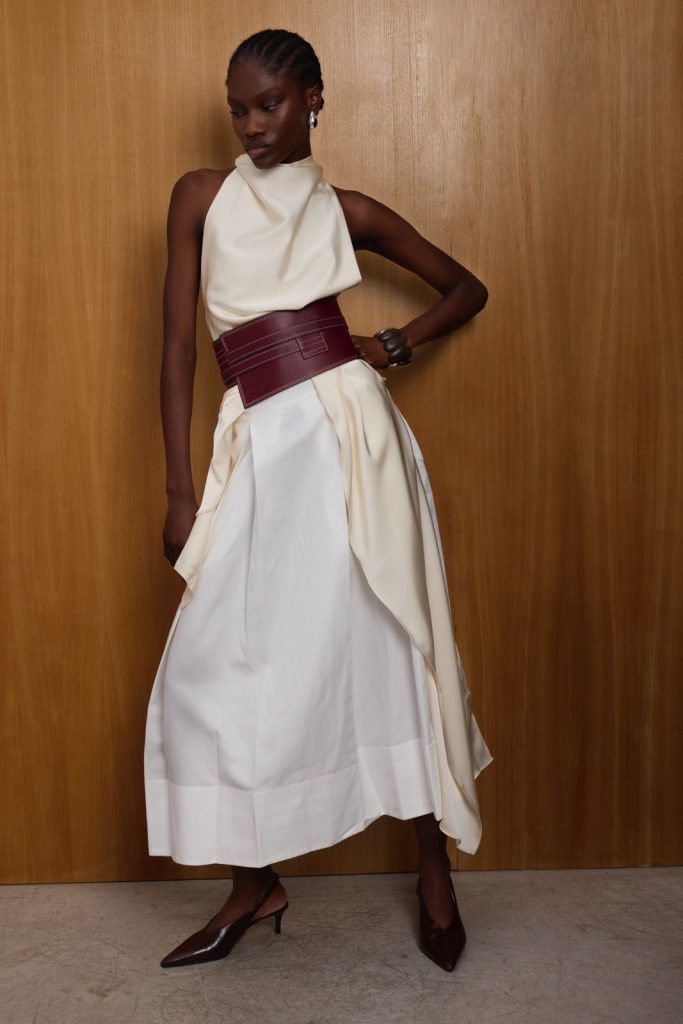 El diseño elegido es LA ESPABILÁ, de la firma española Casoná: un cinturón de cuero estructurado, con cintura ancha, panel asimétrico y ajuste frontal con cordones de cuero. Está confeccionado en talleres artesanos de Madrid con piel de Ubrique, cuidando cada detalle para conseguir una pieza que estiliza, da presencia y juega con los volúmenes sin rigidez. El que lució Lucía era en tono marrón chocolate, aunque el modelo está disponible en varios colores.
