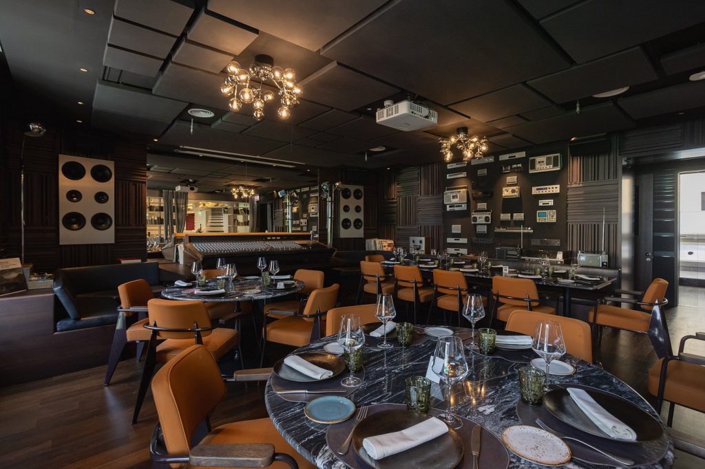 Situado en las dos últimas plantas del edificio WOW Concept, Gran Vía 18 no es solo un restaurante, sino un recorrido sensorial por el sabor y la estética. Sus más de 1.000 metros cuadrados combinan el estilo retrofuturista con una atmósfera cálida y sofisticada: sofás curvos, librerías repletas de vinilos y un rooftop con vistas espectaculares a la arteria madrileña.